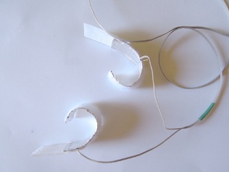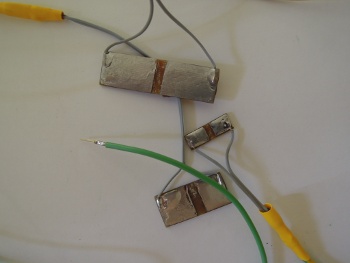 Los sensores hechos con un velcro y folio de aluminio dan buenas resultados. Con la maquina de coser he fijado el cable (cable de bus para PC). Es importante de tener el contacto del cable con el aluminio bien hecho. Con contactos débiles nunca tendrás resultados claros. En todo el tiempo de experimentar el cable nunca me ha suelto. |