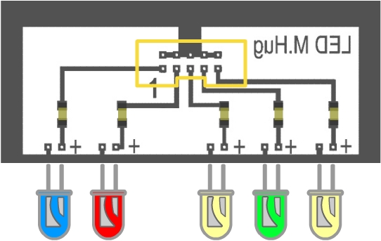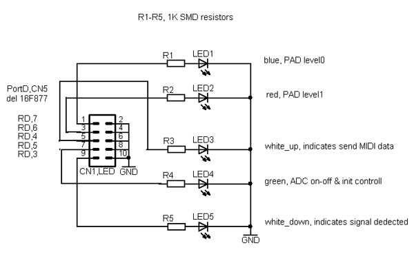 El circuito impreso (PCB: Printed Circuit Board) para los 5 LED's que indican distintos estados del circuito (v. tabla 4) se ha reutilizado de otro proyecto. Por ese motivo para conectar el PuertoD del 16F877 al PCB de los LED's hay que adaptar el cable (v. esquema). |